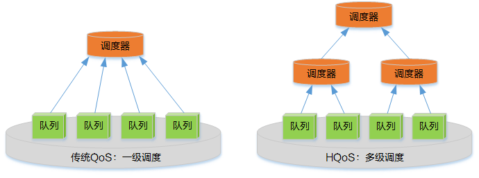 为了解决上述问题,人们需要一种既能区分用户流量又能根据用户业务的优先级进行调度的技术,HQoS(Hierarchical Quality of Service,层次化QoS)应运而生。HQoS通过多级队列进一步细化区分业务流量,对多个用户、多种业务等传输对象进行统一管理和分层调度,在现有的硬件环境下使设备具备内部资源的控制策略,既能够为高级用户提供质量保证,又能够从整体上节约网络建设成本。