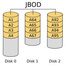 JBOD 为 ”Just a Bunch Of Disks” 的缩写,意思就是「一堆硬盘」,指的是RAID 磁盘阵列以外的所有组态。实际上 JBOD 有 2 种方式,第一种与我们直接将硬盘安装在计算机中相同,各颗实体各自管理自己的容量,当然也可进行磁盘区分割。第二种则是能够将不同实体硬盘的空间串在一起,例如 2 颗 1TB 硬盘串成 1 个 2TB 的空间运用,如此能够放入大于 1TB 的单一档案。